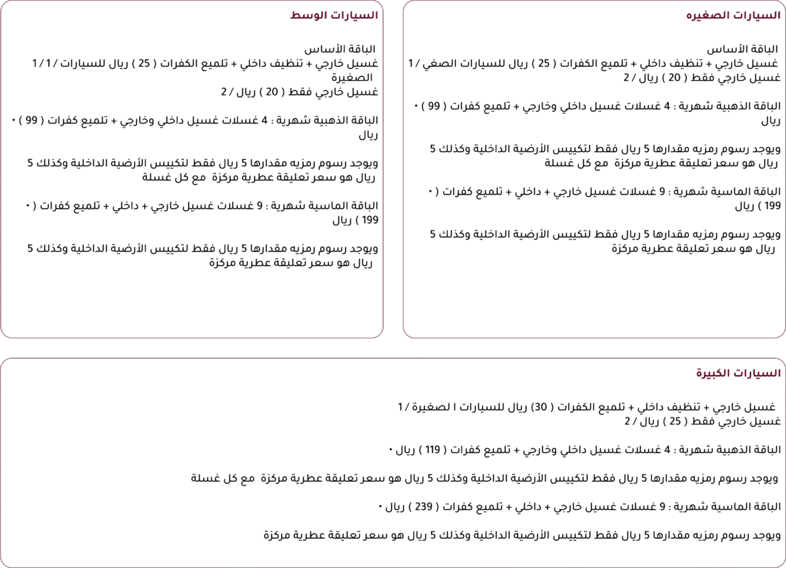 نوفــر لك باقة متكاملـــة من خدمــــات غسيل السيــــارات باستخدام أحدث الأجهـزة والتقنيـات وأفضل المنتجـــات للحفــــــاظ علـــــى جمـــــــال سيارتـــــــك ولمعانهـــــــا الــــــدائم